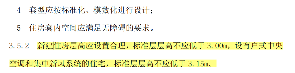 住宅层高不低于3米,有户式中央空调和集中新风系统的住宅,层高不低于3.15米。