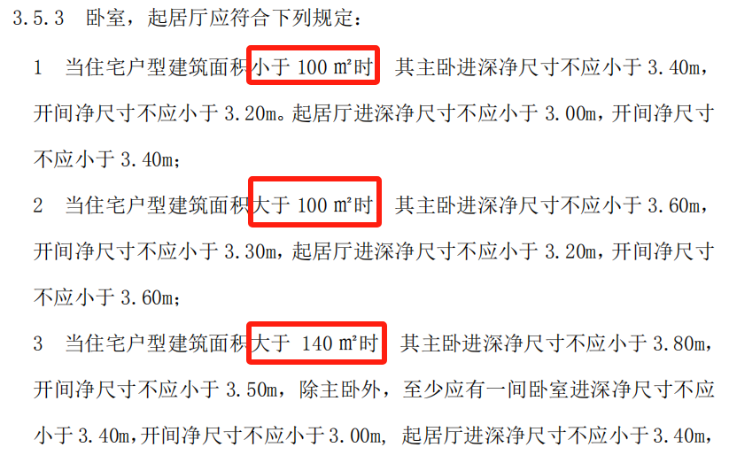 建面小于100㎡时,主卧不小于10.88㎡;客厅开间不小于3.4米,客厅不小于10.2㎡。