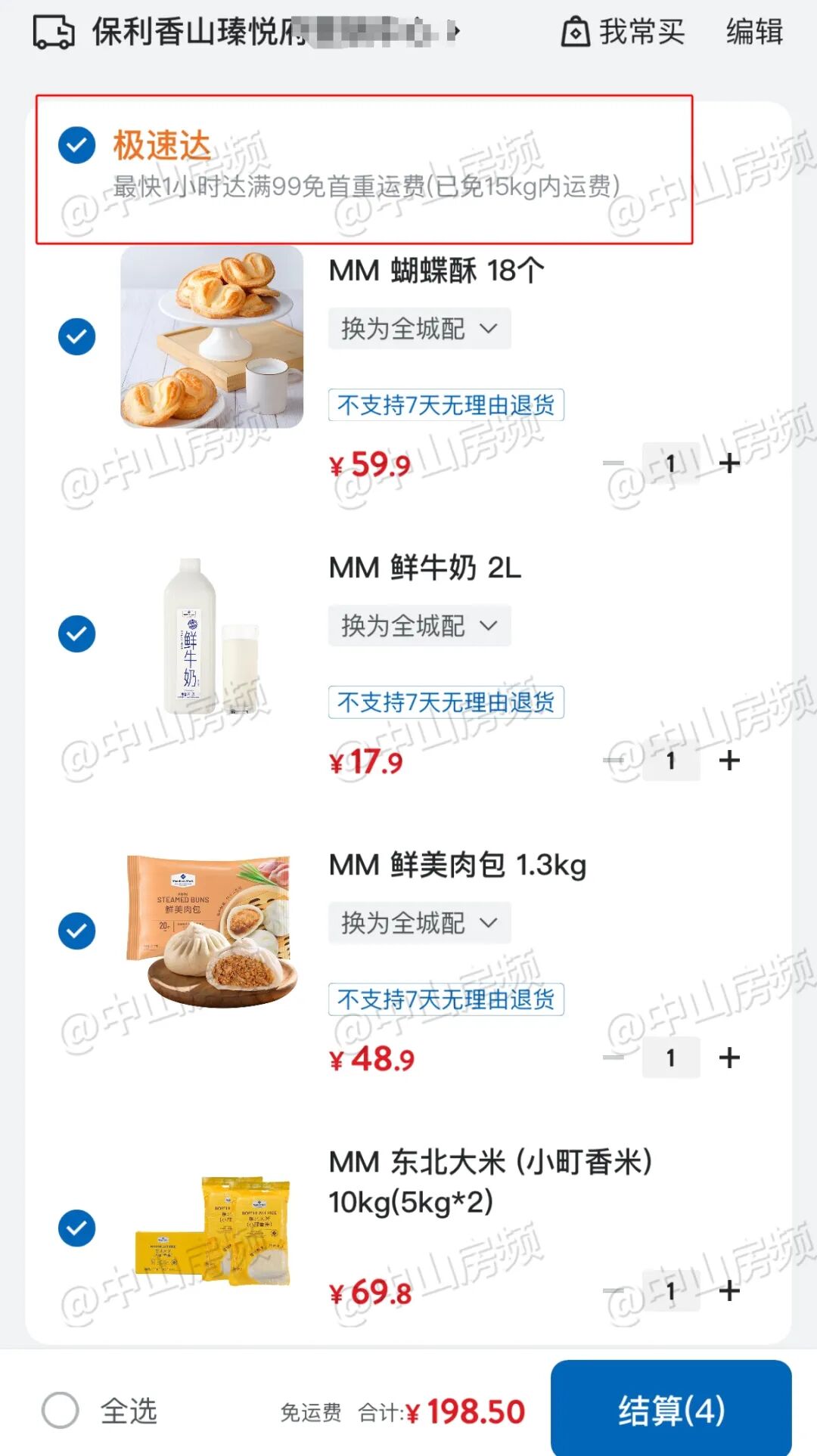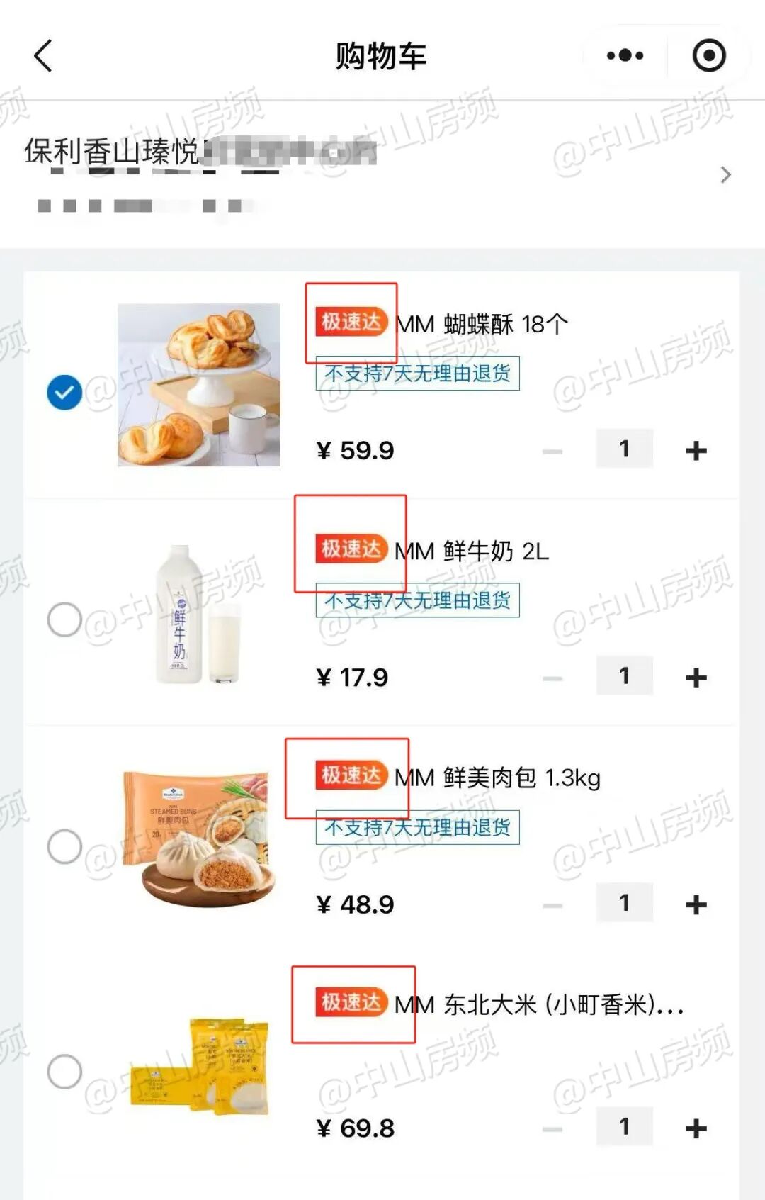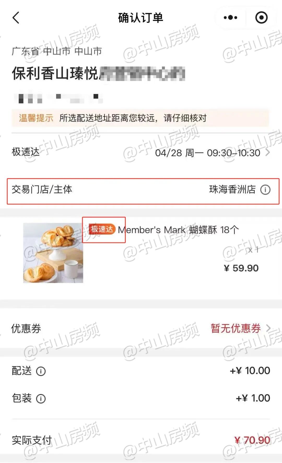 已收到小伙伴反馈:山姆极速达真的很快!4.27晚上11点尝试下单成功!然后今天一早就收到了!用手机测试,以范围内的保利香山瑧悦为配送地址,可以看到极速达商品的筛选按钮已经开启,显示“最快1小时达,满99免首重运费”!打开小程序“山姆极速达”,更可以看到符合条件的商品均打上了“极速达”的标签!因为中山山姆尚未正式开业,在付款页面可以看到,目前交易门店/主体仍是珠海香洲店。据悉,中山山姆首个极速达,范围主要在博爱七路片区,覆盖有保利瑧悦、傲峰天御、尚东新天地、观岭、凯茵云顶、华鸿璟悦轩、永怡聚豪园等小区!也就是说,今天开始,这些小区的业主们,可以享受中山山姆极速达服务啦!中山山姆