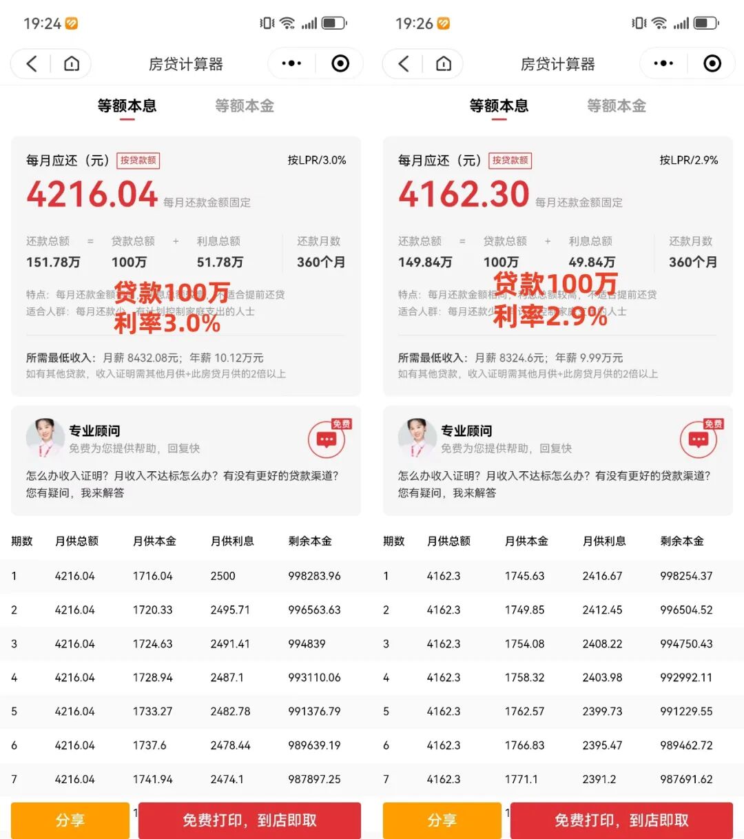 按利率2.9%,贷款100万元30年的商业贷款计算,等额本息还贷方式下,中山购房者月供降了53.74元,30年房贷利息少支付1.94万元。