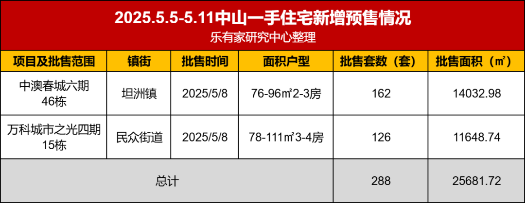 昨日,中山首个官方认证的4.0住宅龙湖香山颂开盘,此次开盘主打大户型,包括169㎡和139㎡,开盘当日即接近售罄。本次开盘总体可售货量上,除样板房外共计119套,主要为117㎡、139㎡、169㎡豪装4房。截至晚上8点,1天卖房超过100套!尤其7栋169㎡30套楼王单位,开盘1小时即日光。此次龙湖香山颂销售火爆,再次证明中山改善客群的实力,好产品好房子的吸引力!大量改善型需求将进一步刺激中山房地产市场快速回暖!详情请看:改善客发力!中山首个4.0住宅169㎡楼王火速日光!(乐有家研究中心)乐有家研究中心数据,上周日(5月11日)中山门店二手住宅签约量快速恢复至五一高峰,也是近一个月高位。近日央行新一轮货币政策出台,降准降息降公积金利率接连落地,业主信心及预期大涨,还有不少购房者等待LPR下调后出手,预计5月20日LPR下调落地后,中山买房成本来到历史最低点,中山二手住宅交易量将继续攀升,有望达到今年最高峰值。(乐有家研究中心)【中山】上周一手住宅新增预售情况:坦洲镇批售162套住宅、批售面积14032.98㎡;民众街道批售126套住宅、批售面积11648.74㎡。全市上周合计批售288套新房住宅,合计批售面积达25681.72㎡。