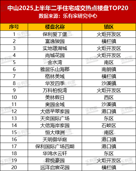 2025上半年中山成交热点小区TOP20,70%在中心城区