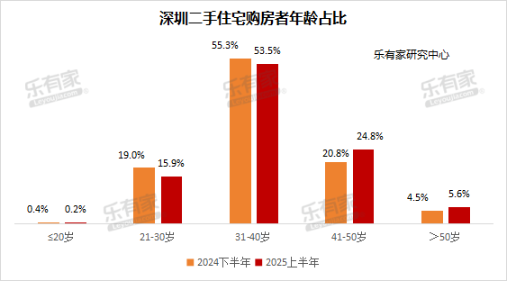 乐有家研究中心数据显示,2025上半年深圳二手市场平均购房年龄增加,提升到37.6岁,环比增长近1岁。 分年龄段看,2025上半年41岁及以上年龄段的占比提升,其中41-50岁占比大幅度提升了4个百分点。购房人群“老龄化”趋势明显。 随着人口老龄化趋势加剧,银发经济下,楼盘的养老、康养中心配套被越来越多人重视。