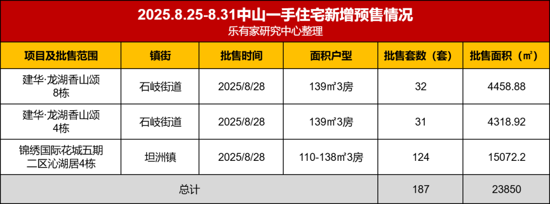 中山火炬一天吸金超百亿!安居火炬最高可获15万房补 8月28日,中山市举行招商引资项目集中签约仪式,现场集中签约项目20个,总投资额超100亿元。签约项目聚焦智能装备、光电信息和健康医药三大战略性新兴赛道。在建设“湾区产业高地”过程中,火炬高新区展现了其作为粤港澳大湾区重要增长极的吸引力。为满足不断增长的企业和人才需求,火炬高新区也推出购房补贴政策,首次购房者及外地户籍人员可获得最高15万元购房补贴,旨在降低安家中山的成本。(综合自中山火炬发布) 官宣:中山山姆,9月10日正式开业! 据官方透露,山姆会员商店中山店,将于9月10日正式开业。山姆的到来,无疑会为烟火气升腾的中山商业市场再添一把火。中山山姆会员店开业后,将有效地辐射中山以及珠江西岸的消费群体,带动中山消费场景提档升级,增加就业岗位,促进本地零售供应链发展,同时也将进一步优化城市投资环境,推动岐江新城高质量建设。(中山发布) 中山第2个盒马站,正式开张! 8月31日,中山盒马高亮原路站正式营业上线。打开盒马APP线上购物,最快30分钟直接送到家门口!据悉,本次盒马新上线的站点配送范围,东至翠景南路世纪新城、南至隆兴南路华发四季-华发生态园,北至富华道西区核心黄金地段,西至宝珠中路沙溪镇行政中心,覆盖中山沙溪镇核心区域。(中山房频) 中山一校新增3000个学位,全市首创架空运动场! 中山市东区松苑中学新校区已建成,9月1日起同学们将踏入新校园。中山市东区松苑中学新校区坐落于东区街道长江北路东侧,用地面积约4.68万平方米,总建筑面积约7.26万平方米,为高标准信息化全寄宿初级中学,可提供优质初中学位3000个。9月1日起,松苑中学初二、初三级学生将在这个学校就读。松苑中学新校区的运动场所丰富,创新亮点之一是中山市首个架空田径运动场,场地开阔平整,除了有400米跑道、足球场等基础运动设施外,还加高了外围护栏。同时,还配备有室内、室外篮球场满足学生日常运动需求。(中山日报) 供求比0.88,去化周期11个月,广州荔湾楼市强势领跑 广州市住建局在调研会上指出,当前楼市面临供需不均衡的问题,而吸引改善性住房需求是解决关键。专家表示,白鹅潭板块正经历集中兑现期,交通、商业和文化等配套设施逐步完善。诚汇新都是该片区最大的旧改项目之一,目前表现强劲,销售额达10亿元。榕府组团楼王产品以智能化设计和高得房率受到改善客群青睐。荔湾楼市则显示出强劲韧性,1~7月新房成交31.62万平方米,供求比例为0.88。预计未来将有多个新盘入市,区域文化和商业投资持续注入活力。荔湾大湾区艺术中心的开放成为文化新地标,先进的交通网络也在促进区域发展,随着配套设施的完善,荔湾区房地产市场呈现止跌回稳的态势。(中国房地产网) 9月1日起,东莞调整房价标准 昨日,东莞市住房和城乡建设局官网发布了《关于调整我市普通住宅价格标准的通知》,此次调整自9月1日开始,系今年第二次调整。普通住宅价格标准分为四类,一类标准适用于松山湖高新区等区域,价格低于38482元/平方米;二类标准适用于虎门镇等区域,价格低于31005元/平方米;三类标准适用于大岭山镇等区域,价格低于24401元/平方米;四类标准适用于石碣镇等区域,价格低于18849元/平方米。与上一期标准相比,一类和二类标准有所下调,而三类和四类标准有所上调。具体的调整城市包括莞城街道、寮步镇等六个镇街。 此次普通住宅价格的调整是基于2025年上半年各园区、镇街的平均交易价格,旨在落实国家和省相关政策,实现土地增值税的免征。新标准适用于全市范围内的商品房买卖合同,自2025年9月1日起生效,为当地购房市场提供了明确的指导和参考依据。(东莞阳光网) 深圳国企中标,珠海新体育中心来了! 日前,横琴体育中心的工程设计前咨询服务由深圳市建筑设计研究总院有限公司中标,金额为149万。中标公司将负责项目前期研究方案编制及项目立项协助,为后续动工做准备。项目总用地面积约为26.1万㎡,包含体育公园和横琴国际网球中心等已建地块,以及其他综合体育设施的研究和规划。该中心将设有全民健身中心、综合体育馆和文化演艺综合体,并与滨河沙滩运动体育公园相结合,形成多元化的文体活动空间。此外,珠海市体育中心也拟重建,将规划新体育设施。高新区体育中心已在建,预计2026年完工,而白藤及香洲区体育中心尚在规划中。(珠海房姐)