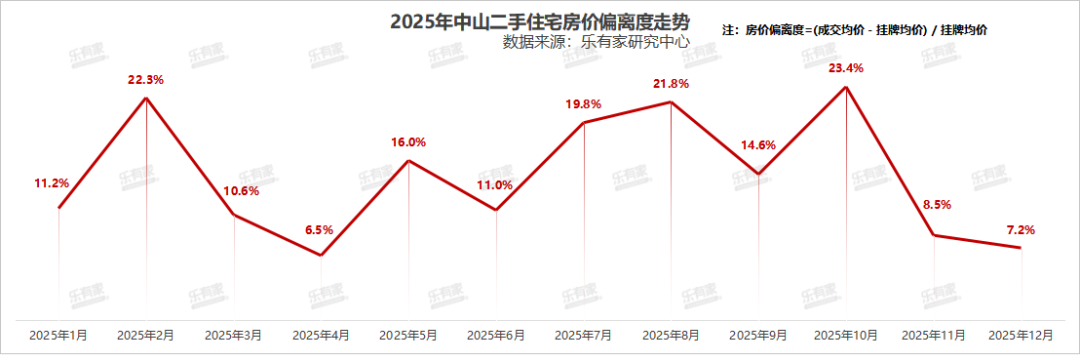乐有家研究中心监测近期房价数据显示,中山二手住宅房价偏离度,已经回到了年内低位水平,挂牌均价与成交均价的偏离度降至7.2%。房价偏离度为成交均价与挂牌均价差值,与挂牌均价的比值,是衡量市场冷热的温度计之一,反映市场情绪的变化。