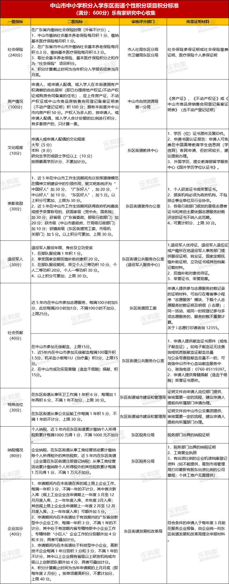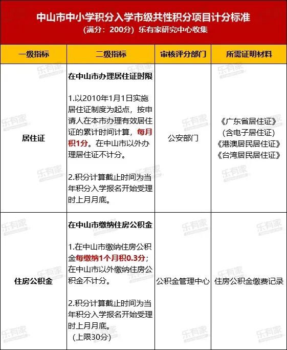 中山积分入学满分800分,其中市级共性项目200分,镇街个性项目600分。各镇街个性积分项目可结合经济社会发展需要自行设置,如文化程度、社会贡献、表彰奖励、特殊岗位、投资纳税、房产情况等,其中“参加社会保险”“退役军人服役情况”为必选项目。镇街个性项目积分上限600分。目前,2026年市级共性项目计分标准已经出来,乐有家研究中心整理如下,各镇街个性积分项目计分标准也在陆续出台(如东区),家长们也要随时关注。(乐有家研究中心)